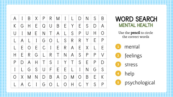 Solving word searches has many mental health benefits. Reasons word searches are great for your mind 1.Relaxes the mind, and they are therapeutic Stress and anxiety due to the daily routine can take a toll on your mental health. When you play word searches, it distracts your mind from prevailing stressors and helps you cope with the situation. Mental Health Awareness ... What to look for and how to cope. Data Consent Preferences Site Map Privacy Policy © TheWordSearch.com. Printable Word Searches Play ... A printable mental health word search containing 22 words. Add your own words.