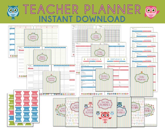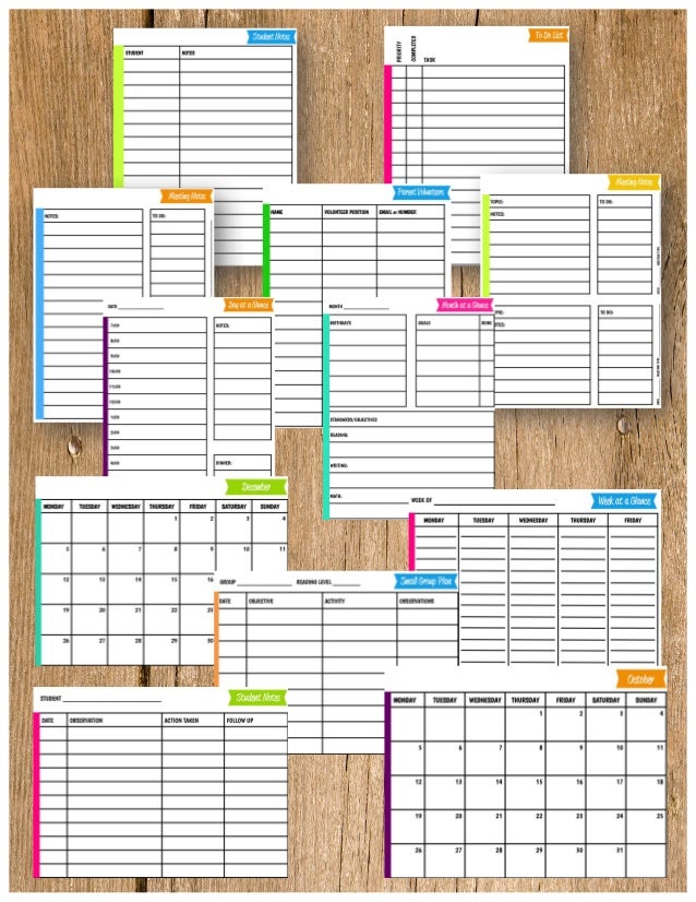 Teacher Planner Covers Inside the colorful lesson plan book, you'll find eleven bright and bold covers. Pick a favorite, click the grey text box to type in your name, and print it out. Easy peasy. Organization Pages The teacher planner also includes tons of sheets to keep you super organized from day one.