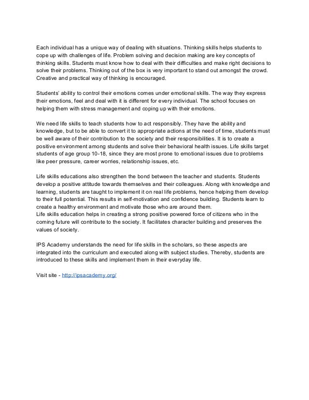 Life Skills Life Skills 7 This course uses the Positive Action curriculum to teach students valuable life skills. Students will learn how positive actions can help to create a positive self-concept. This course goes over physical, intellectual, and social skills to help students improve their self-concept. The students will learn these concepts and skills through […] The content of this handbook has been developed by applying internationally accepted training techniques, covering the ten core life skills: Self Awareness, Empathy, Effective Communication, Inter Personal Relationship, Critical Thinking, Creative Thinking, Problem Solving, Decision Making, Coping with Stress and Coping with Emotions. LifeSkills Training is comprehensive, dynamic, and developmentally designed to promote mental health, social-emotional (SEL) skills and positive youth development. NEW: LST Galaxia - an engaging and interactive game designed to prevent Bullying, Cyberbullying, Substance Use, and Violence The good news is you can teach life skills from basic responsibility to home economics in your everyday classes. Follow the guide below to implement life skills curriculum into your classroom. Teaching Money Management One of the best things we can instill in elementary students is the why money matters.