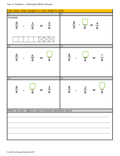 How do you subtract a fraction from a whole number. How to Find Common Denominators Before we learn how to add and subtract fractions, we need to learn how to find a common denominator. So the 4 in a fraction like 3/4 means that we're breaking a whole number of somethings up into 4 equal parts. And the 3 in 3/4 therefore tells us that this fraction represents the... Fractions Worksheets | Subtracting Fractions and Whole Numbers... This fraction worksheet is for practicing subtracting fractions from whole numbers. You can select from five different degrees of difficulty. The answer worksheet will show the progression on how to solve the problems. First convert the whole number to a fraction. Adding and Subtracting Fractions: Why Do They Need the Same... When you add or subtract fractions, you can't express the result as a fraction if you do not divide the total into equal parts. I wanted to teach addition and subtraction of fractions to kids and I was going bonkers on how to explain the theory behind the necessity of having a common denominator. PDF Adding and Subtracting Mixed Numbers When counting improper fractions and mixed numbers, we are counting the number wholes and parts. Note: The rules for adding and subtracting improper fractions are the same as working with proper fractions. However, driving takes 1⅛ hours. How much time do you save by driving?