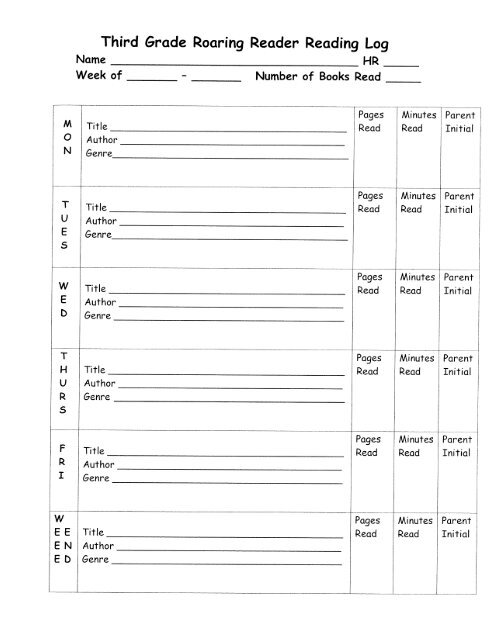 Third Grade Reading Log Form Template | Printable Example Third Grade Reading Log Form Template- Printable Example: File Info: Explore More Free Printables: Log Template Available Format: PDF License: Free for Educational Purpose. Created By: File Size: 147 KB Download file type: WinRar (PDF) To use this PDF file you need Adobe. Download Third Grade Reading Log Form ExampleTemplate | FREE Printable Format The Guide to 3rd Grade: Reading and Writing | Scholastic ... Third grade reading focuses on teaching kids how to think and talk about what they read in deeper and more detailed ways. Students read longer texts, and most read fictional chapter books . Many reading lessons in 3rd grade are dedicated to writing and talking about the meanings, lessons, and important ideas in texts. Free Printable Reading Log Template | Bullet Journal ... Reading Log. This reading log printable records the books you read and the author of each book. Select any reading log template and add a border or print a blank book log. You can also edit the text. This book tracker template has space for the author, title, genre and rating. However, the text is editable so you can change the sections.