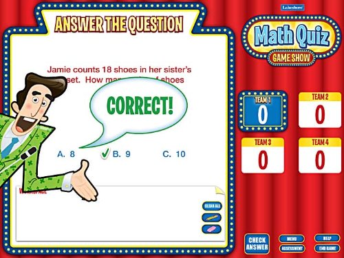 Math Quiz Game Show - Gr. 1‑3 - Interactive CD-ROMs at Lakeshore... Math Quiz show. April 29, 2015 - By JLHsc from SC. My students love competition. I gave them whiteboards and put them in groups of 3. They loved Kids LOVE this game show. This game is great for a quick review. I love that I have the option to customize the categories that are used each time we...