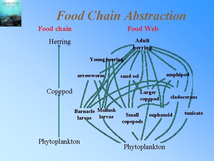 Open ocean habitat - MarineSpecies Introduced Traits Wiki This food chain is called microbial loop. This loop recycles organic matter that is too small to be consumed by metazoan plankton. The greater the depth, the more organisms are confronted with increasing physiological stress. One of these stress factors is pressure. Pressure increases by 1 atmosphere for every 10 meters increase in depth. Marine Food Chain - National Geographic Society The bottom level of the ocean's food chain is made up of one-celled organisms called phytoplankton. These tiny organisms are microscopic. They are so small they cannot be seen without a microscope. Billions of phytoplankton live in the upper part of the ocean. They take in the sun's light. PDF OPEN OCEAN FOOD WEB - Oregon Institute of Marine Biology the loss of producers in a food web or chain. (Producers are the base of the food web— without the producers, the food web would collapse.) 10. Discuss with the students the differences between a food chain and a food web. 11. Have the students identify a producer in the ocean (e.g. phytoplankton), a consumer (e.g. Simply Oceans - The Ocean Food Chain, Producers, Consumers ... Pelagic organisms are those found in the open sea. (Day 119) There are three main types of organisms in the ocean ecosystem: producers, consumers and decomposers. Producers are seaweed and other plants which serve as food for consumers. The animals are termed consumers; they consume plants and animals to survive.