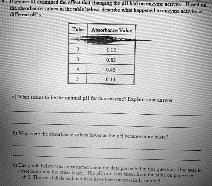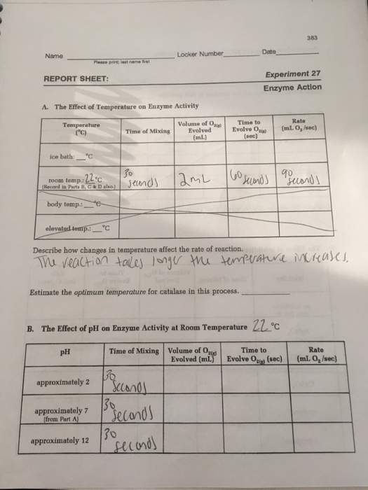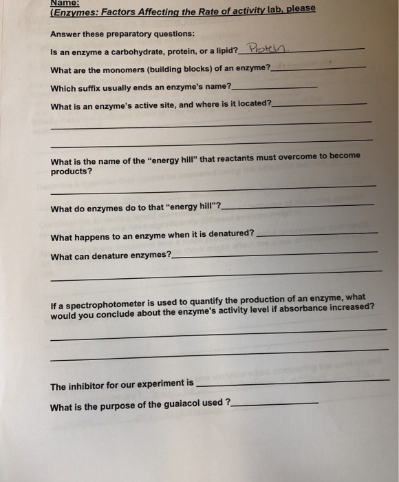 Enzyme activity lab answers. AP BIOLOGY LAB #1 ENZYME ACTIVITY. This activity is an alternative to the titration proposed for Enzyme Catalysis (AP Bio Lab #2, Biology Lab Manual). There are ... Enzyme Activity Lab Report - BIOCHM 1094 - Introductory ... After the enzyme had been isolated, the effect of temperature and time on the enzyme’s activity could then be tested. Three test tubes were labeled with the appropriate temperatures: 40°C, 60°C, and 80°C. 1 mL of 0 M citrate buffer, 1 mL of substrate (1 mM p-nitrophenyl glucopyranoside or pNPGP), and 0 mL of dH 2 O were added to each tube ... SAY IT WITH DNA: PROTEIN SYNTHESIS WORKSHEET: Practice Pays 1. This activity provides a logical activity to use following your Protein Synthesis reading assignment. 2. Be sure that students understand the significance of controlling protein production, namely the "One Gene - One Enzyme" concept: each step of a biochemical series of reactions requires a unique enzyme which in turn is the product of one gene. ENZYME ACTIVITY LAB worksheet.docx - ENZYME ACTIVITY LAB ... ENZYME ACTIVITY LAB ANSWER SHEET 1. Effect of Temperature Effect of Temperature on Enzyme activity RUN Temperature (0 C) Product produced Product concentration when the plateau is reached (mM) Time to reach the plateau (min) 1 0 2 25 3 37 4 60 5 75 6 100 Insert your screenshot below. 2.