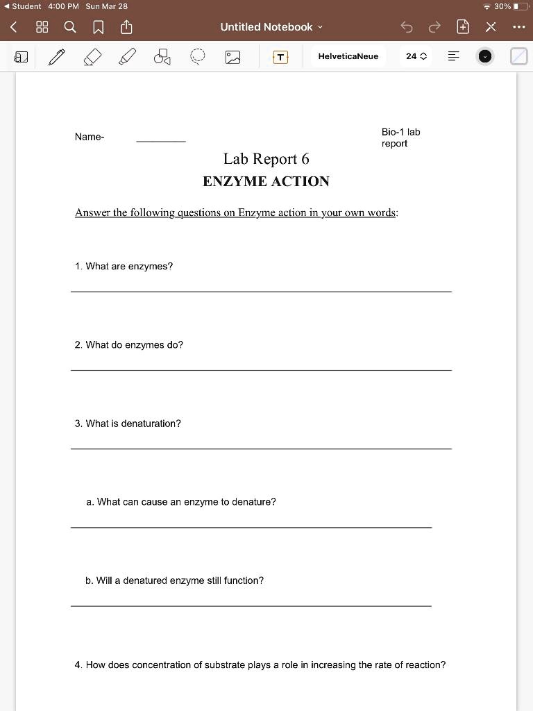 What Effects of Concentrations of a Substrate on Enzyme Lab ... What Effects of Concentrations of a Substrate on Enzyme Lab Answers ... recording how different concentrations of a substrate affect the enzyme's activity, ... Enzyme Catalysis Lab Report-1 - sas.upenn.edu 1. Pour 5ml of substrate, 0ml of enzyme (no enzyme for negative control), and .5ml of water into test tube A1. 2. Seal test tube A1 with a stopper immediately after the enzyme is added. 3. Record the reaction rate using the Logger Pro software. 4. Repeat steps 1-3 using the new measurements as described in table 1. Table 1 Substrate Enzyme ... Enzymes | Biology I Laboratory Manual - Lumen Learning describe the specific action of the enzyme catalase, include the substrate and products of the reaction; list what organelle catalase can be found in every ...