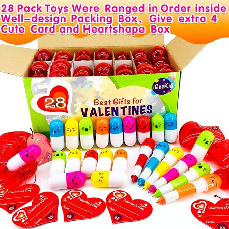 28 Pack Valentines Day Stationery Party Favors Pack Retractable Pen Filled Hearts Valentines Cards for Kids Classroom School Exchange Party Favor ...