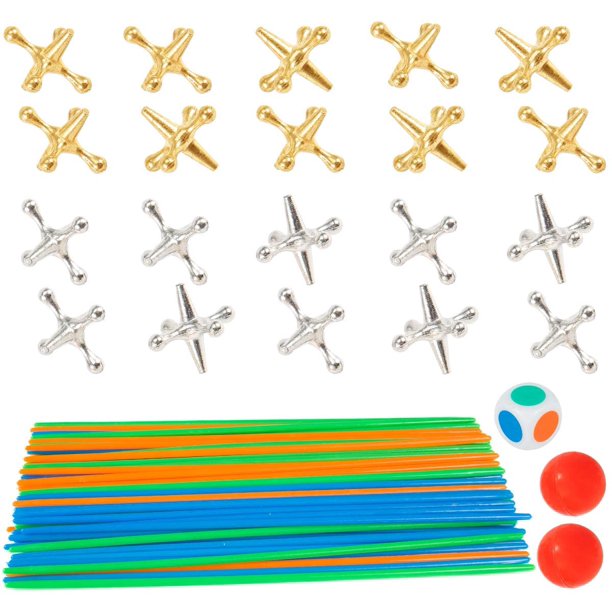 Jack Games 20 Pcs Gold and Silver Toned Jacks 2 Red Rubber Bouncy Balls with 100 Pieces Pick Up Sticks Cl c Game of Jacks for Party Favor Game Prizes ...