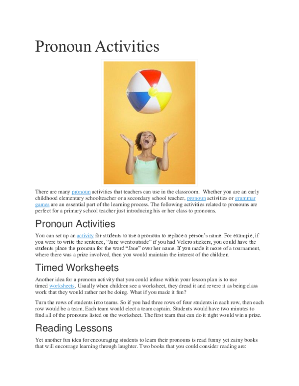 Pronoun Worksheets and Activities | Ereading Worksheets Pronoun Worksheets, Lessons, and Tests Pronouns are words that take the place of nouns. They minimize redundancy in language. For example, instead of saying, "John went to John's house because John's mom wanted John home," one can say, "John went to his house because his mom wanted him home." Pronouns save a lot of syllables.