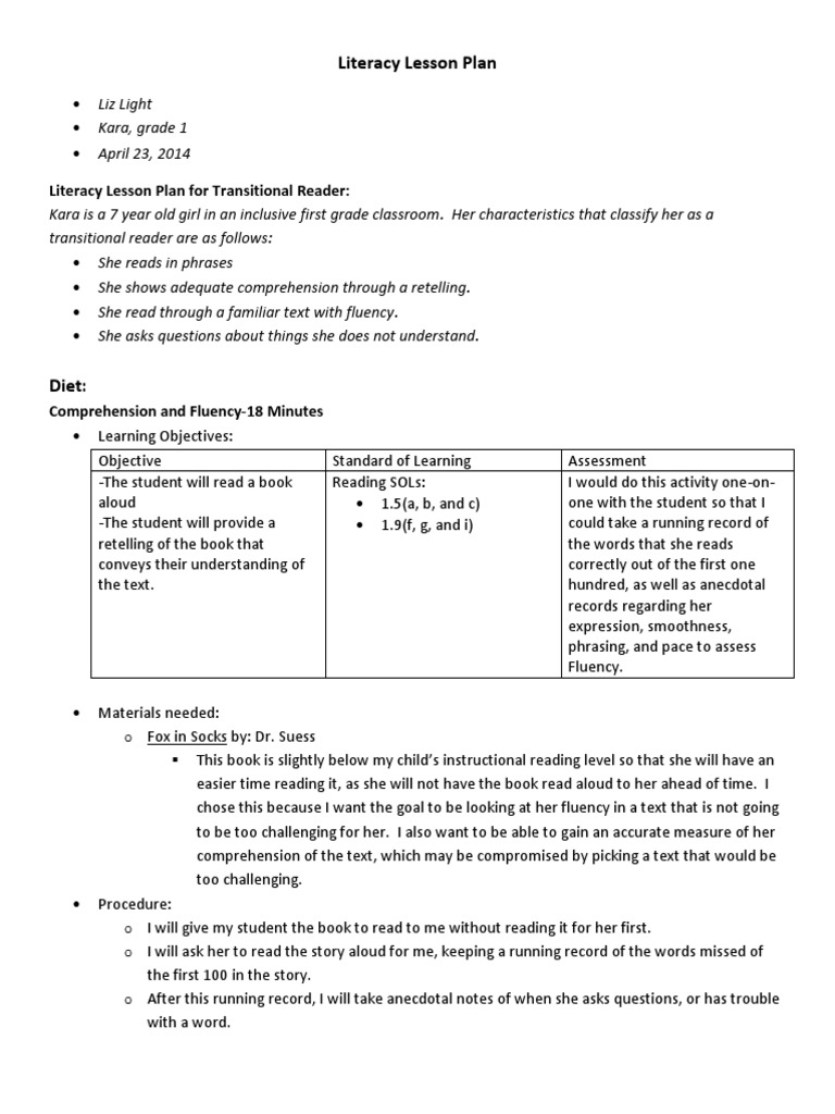 First grade literacy lesson plans. Lesson Plan 1 - Reading Fluency. Created by: Zach Martinez, David Wallingford, & Marissa Elsberry. Objective: The students will reread familiar text to develop fluency. Students will practice reading with speed, accuracy, and appropriate intonation. Learning Context: Students will show the ability to read at a selected target rate. 11. 1st Grade Reading Lesson Plan. blog.accesshardware.com. Details. File Format. PDF; Size: 125 KB. Download. Reading is one of the components of English, along with listening, writing and speaking. It is necessary that children learn how to read, write, listen and speak English regularly. Students should have regular reading classes in the ... Language Arts Lesson Plans and Worksheets for 1st Grade What a Wonderful World Tell Your Story Learn to Build a Mental Image Fun with Clothes Describe Me 1st Grade Sight Words Animal Messages Casey's Clues Scooter Relay So Silly CJ's Puzzles Looking for Words Math Lesson Plans and Worksheets for 1st Grade Understanding Patterns Ship Shapes The First Grade Lesson Template includes title slides for all the activities we recommend for use with first graders. The First Grade Sample Activity Sequence provides a sample of a 5-day sequence of activities for virtual lessons. Finally, the First Grade Sample Lesson provides an example of what a lesson planned with the Lesson Template might ...