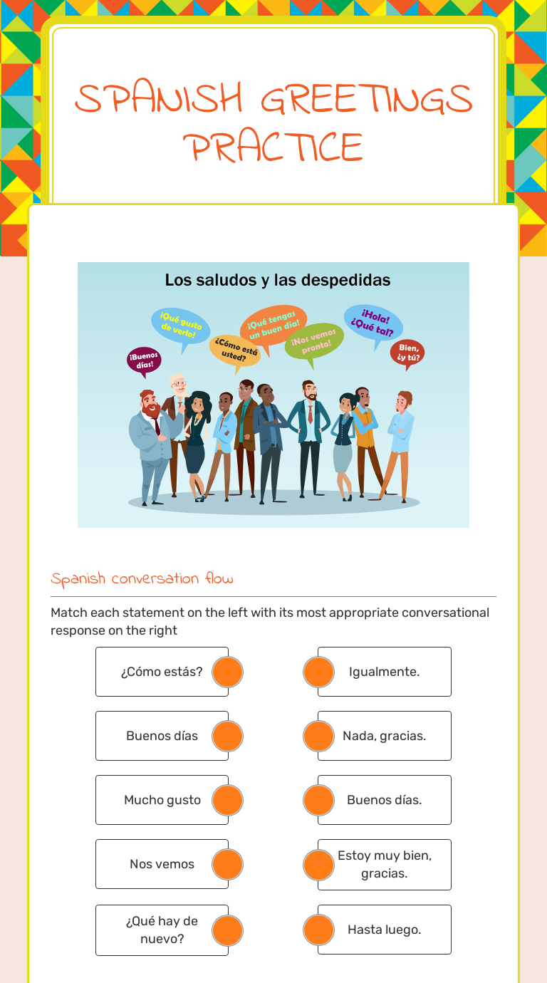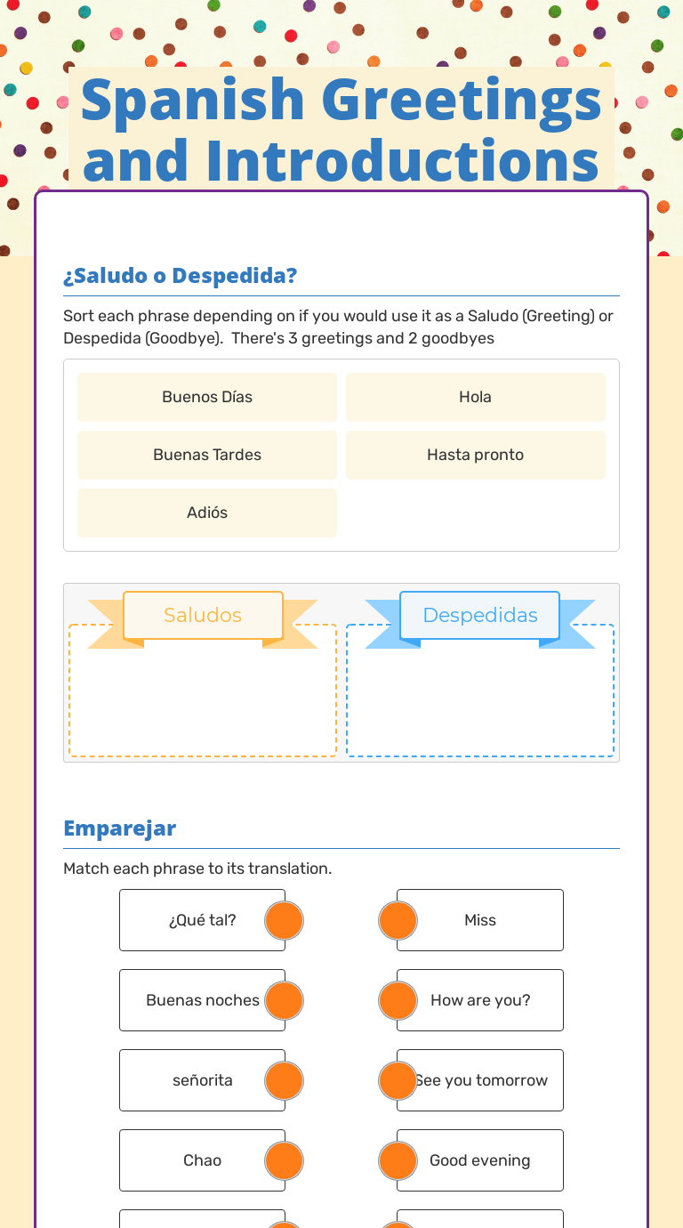 41 spanish greetings and goodbyes worksheets - Search ... Spanish greetings and goodbyes worksheets. Spanish Greetings | Lingvist Spanish Greetings. If you've ever tried to use your foreign language skills with native speakers, you know that how you handle the initial greeting is a Spanish greetings vary widely, depending on the time of day, context, and your relationship with the person.
