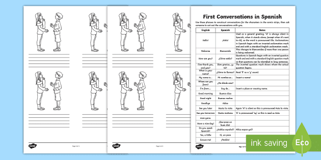 Spanish Greetings Worksheets - Printable Worksheets for ... Spanish Greetings Worksheets Common Greetings in Spanish Greetings are a common part of our daily lives. We meet someone, and 'Hello' is the first thing that comes off our mouth. You are leaving for something, you say 'Goodbye'! Has it ever occurred to you that the Spanish language must have some common greetings as well?