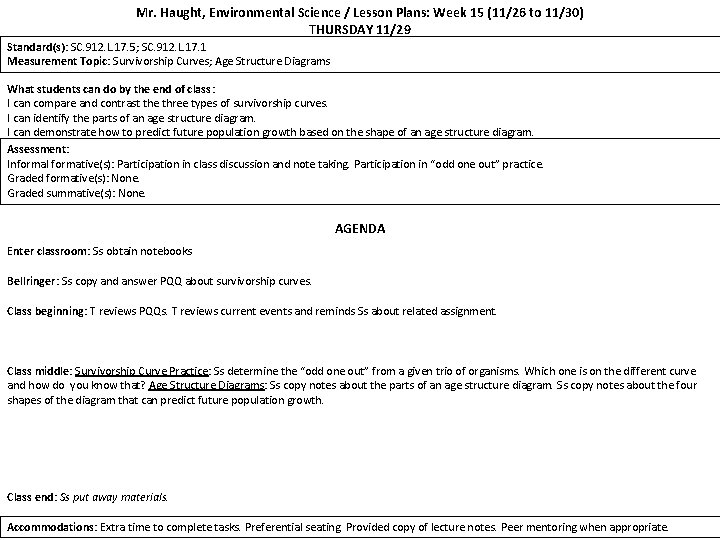 Environmental Science Lesson Plans Environmental Science Lesson Plans Unit 1 – Day 1 Lesson Goals Students will understand my expectations and the requirements of the class. Students will understand how their grade is calculated. Unit 2 Day 2 – 3 Lesson Goals Students will preview what we will do throughout the year by making observations at three different locations.