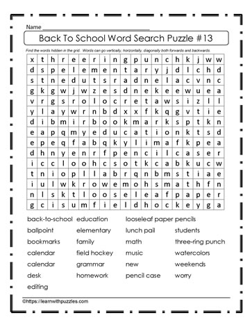 Back to School Word Search Puzzles - Word Search Printables Here is a word search puzzle featuring 13 words related to school and the fun of being back to school after a long vacation. The thirteen words in this word search printable are fun, write, computer, bus, paper, pencil, crayons, read, bookbag, playground, learn, teacher, school. Look keen for the words in all directions.