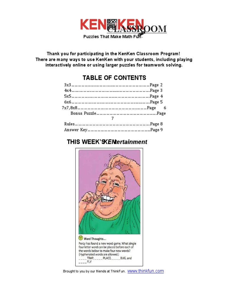 PDF This Week'S Kentertainment Thank you for participating in the KenKen Classroom Program! There are many ways to use KenKen with your students, including playing ... Find the solution at the bottom of the answer key. 3x3 For more KenKen of all sizes and difficulty levels, visit 2 21-1 21-2 21-3 21-4