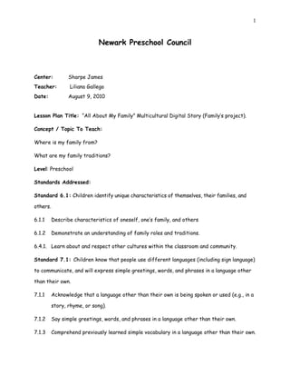 Family lesson 1 lesson plan Upcoming SlideShare. Lesson plan family. Loading in …3. 1. Developing English through ARt, oriented activities (DEAR) UNIT: FAMILY LESSON 1 DIMOTIKO SCHOLEIO DALIOU2, CYPRUS Teacher: Salome Panayiotou - Cyprus OBJECTIVES Language: Pupils should be able to: - identify... English ESL worksheets, activities for distance learning and physical... An elementary text about family and family members. I added multiple reading comprehension tasks. This is a simple lesson plan designed to help lower level students introduce themselves and ask and answer questions about jobs, families... PDF Microsoft Word - snowman_lesson plans-new format by JC.doc Lesson Plan Example 2. Lesson title: Family Trees. Grade level(s): Elementary. In this lesson, students will trace their family history back to their great-grandparents and learn about where their family is from and what types of jobs their ancestors had. Lesson Plan: Families | Blog de Cristina FAMILY, in capitals, because is there anything more important in this world? "Family is not an important thing, it's everything."Michael J. Fox. How far do you agree with Michael J. Fox? This is a lesson for Intermediate students (B1) about Family. In this post you will find A video about.