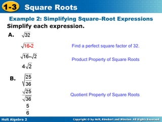 CHAPTER 12: RADICALS Contents E. SIMPLIFY RADICALS WITH NO PERFECT ROOT Not all radicands are perfect squares, where when we take the square root, we obtain a positive integer. For example, if we input √8 in a calculator, the calculator would display 2.828427124746190097603377448419… Square Roots - Simplify worksheet ID: 2433177 Language: English School subject: Math Grade/level: Grade 6 - 8 Age: 11-14 Main content: Numbers Other contents: Square Roots Add to my workbooks (0) Download file pdf Embed in my website or blog Add to Google Classroom