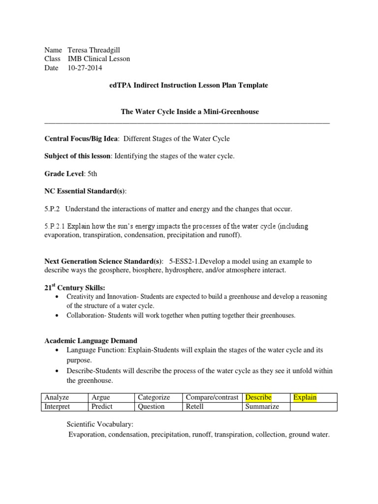 PDF Lesson Plan: Exploring the Water Cycle By: Kim Castagna 2 Where this lesson fits in: This lesson should be done at the beginning of the unit that includes the water cycle. It serves as a way to build upon prior knowledge and introduce new terminology and parts of the cycle not previously learned. Lesson Plan: The Water Cycle in a Sustainable World This lesson plan allows students to learn about the different stages of the water cycle and the factors that influence it. It includes resources that teach students about the different components of the water cycle in detail and how they can be affected by climate change. Water Lesson Plans (6-8) — Department of Ecosystem Science ... Keywords: water cycle, aquifer, buffer strips, ground water, infiltrate, watershed, pollution, erosion; Lesson Plan Grade Level: 5-6; Total Time Required: advance work to prepare stream tables, 2 class periods; Setting: regular classroom, activity may be done outside in good weather PDF Water Cycle | 5E Lesson Plan for Grades 3-5 [PDF] Water Cycle | 5E Lesson Plan for Grades 3-5 [PDF] Subject: This 5E Lesson plan for grades 3-5 helps elementary school students learn about the water cycle. Includes an activity, video, reading material and quiz. Created Date: 11/10/2019 10:45:44 PM