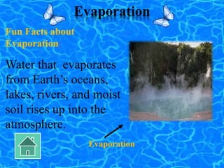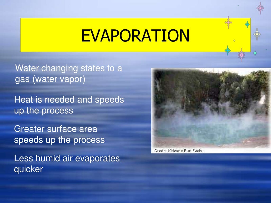 Fun facts about evaporation. Interesting facts about salt | Just Fun Facts The open ocean has about 35 grams (1.2 oz) of solids per liter of sea water, a salinity of 3.5%. When applied to snow or ice, salt lowers the melting point of the mixture. Thus, large amounts are used in northern climates to help rid thoroughfares of accumulated snow and ice. Water Cycle For Kids: 15 Facts, Diagram And Activities Facts About The Water Cycle. Here are a few interesting facts about the water cycle that your children would like to know. The existing water on the planet has been there for millions of years. It gets recycled through the water cycle, predating humanity and likely any life on Earth. Evaporation Facts for Kids - Facts Just for Parents ... Evaporation is the process of liquid water turning into a gas (vapor). Evaporation is a vital component of the Earth's water cycle. Evaporation supports the replenishment of freshwater sources all over the planet. The sun powers the evaporation process on Earth via solar energy. Water evaporates when molecules on its surface absorb enough energy What is Evaporation? Process and Factors Affecting ... Evaporation depends greatly on the water vapor present in the air. The lesser the water vapor, the quicker the cloth gets dried. The more there is water vapor in the air, the more time it takes for the water to get evaporated and make our clothes dry. READ: What is the Process of Soil Formation and Factors That Affect Soil Formation? 4. Wind Speed