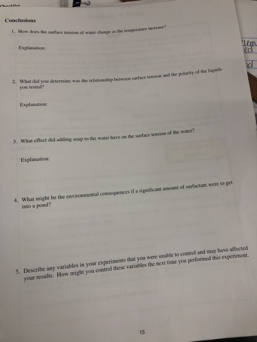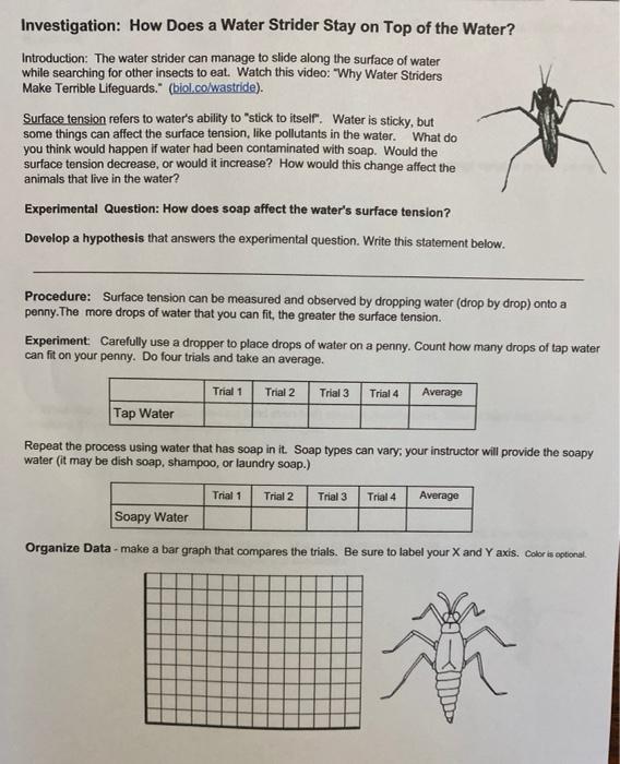 Question: How does soap affect the water's surface tension? How does this model the impact that pollutants can have on water? Background Information. : Mobility. Organisms such as Pond Skaters use the surface Analyze the data and draw conclusions. Write a paragraph below (using complete sentences) that explains how soap affects the surface tension of...