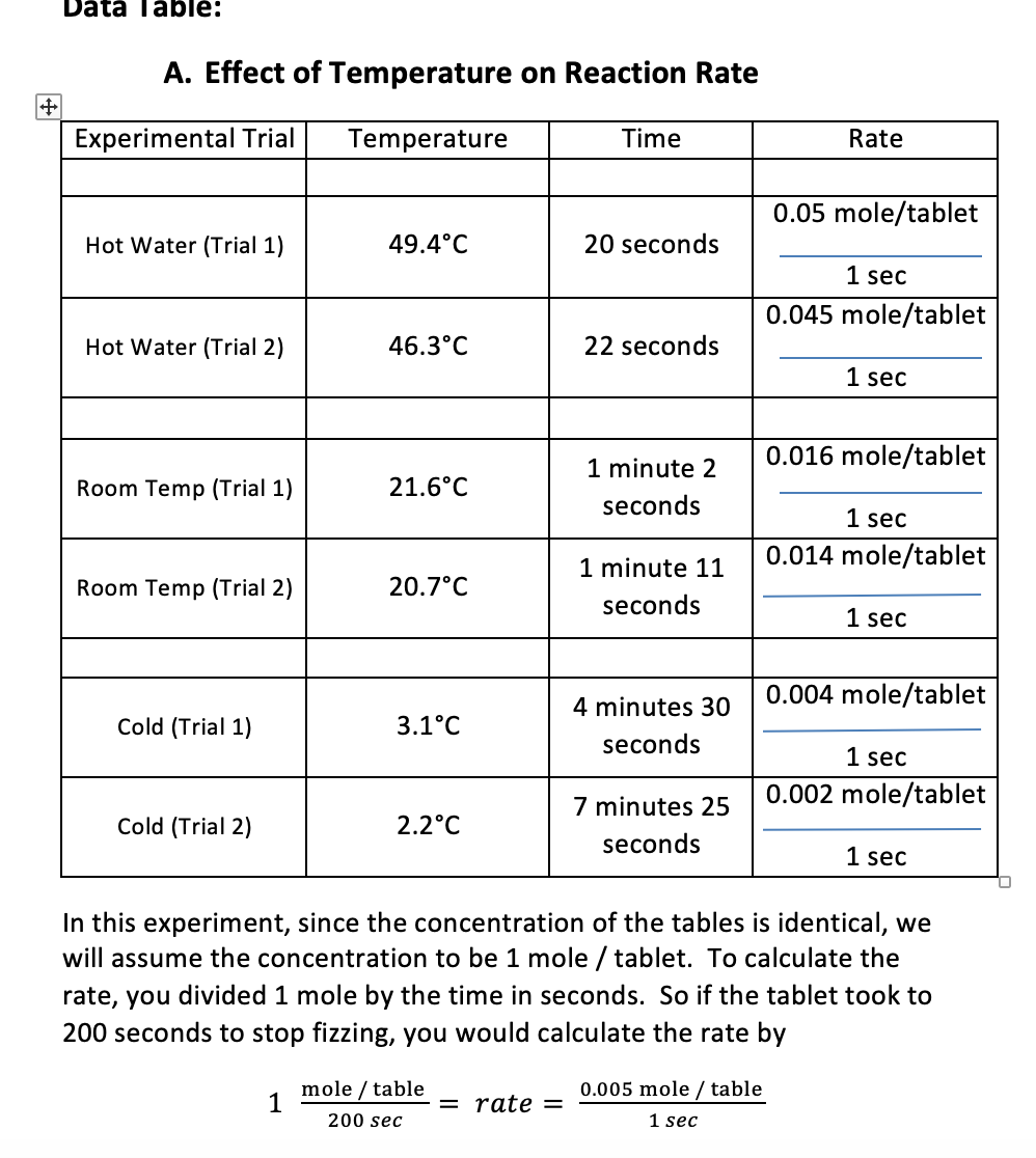 PDF Temperature & Chemical Reaction Rate Lab 3 Alka-Seltzer tablets (Each tablet broken into fourths) Timer . Mortar and pestle . Water - Cold, Hot, Room Temperature. Procedures: A. Hot Water 1. Fill a beaker with 250ml of hot water. 2. Use the thermometer to take the temperature and record it on your data sheet. 3. Drop a quarter of an Alka -Seltzer tablet into the hot water. 4.