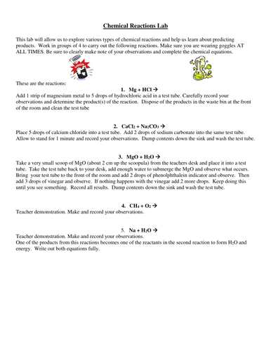 PDF Vasquez High School -- Chemistry -- Chemical Reactions Lab ... Each time we combine a pair of reactants, you must carefully observe if anything has occurred. If you are not sure, do it again. You can use your lab book in class for rough results; when you are sure, write them here. PROCEDURE: 1) You are to obtain any 6 reactants. Write their letters, chemical names, and chemical formulas here. 15+ STEM Lessons and Activities to Teach Chemical Reactions Activities to Explore Chemical Reactions 1. Elephant Toothpaste There is no actual toothpaste involved, but the Elephant Toothpaste reaction creates a fun, high-impact foaming demonstration of the reaction created when hydrogen peroxide is mixed with yeast and dish soap. 10 Amazing Chemical Reactions - ThoughtCo Mixing baking soda and vinegar is a popular way to see what happens when chemicals react. If you want to learn more about chemical reactions, there are plenty of others you can perform at home or in a school lab. The 10 below produce some of the most amazing results. 01 of 10 Thermite and Ice CaesiumFluoride / Wikimedia Commons / CC by 3.0 PDF 1-5 Types of Chemical Reactions stations lab fy11 CP Chemistry Theodore Roosevelt High School Lab #1-5 Types of Chemical Reactions Lab Introduction During any chemical reaction, the Law of Conservation of Matter must be satisfied, meaning that there must be the same kind and number of atoms on each side of the chemical equation. Recognizing and using categories of reactions can make determining