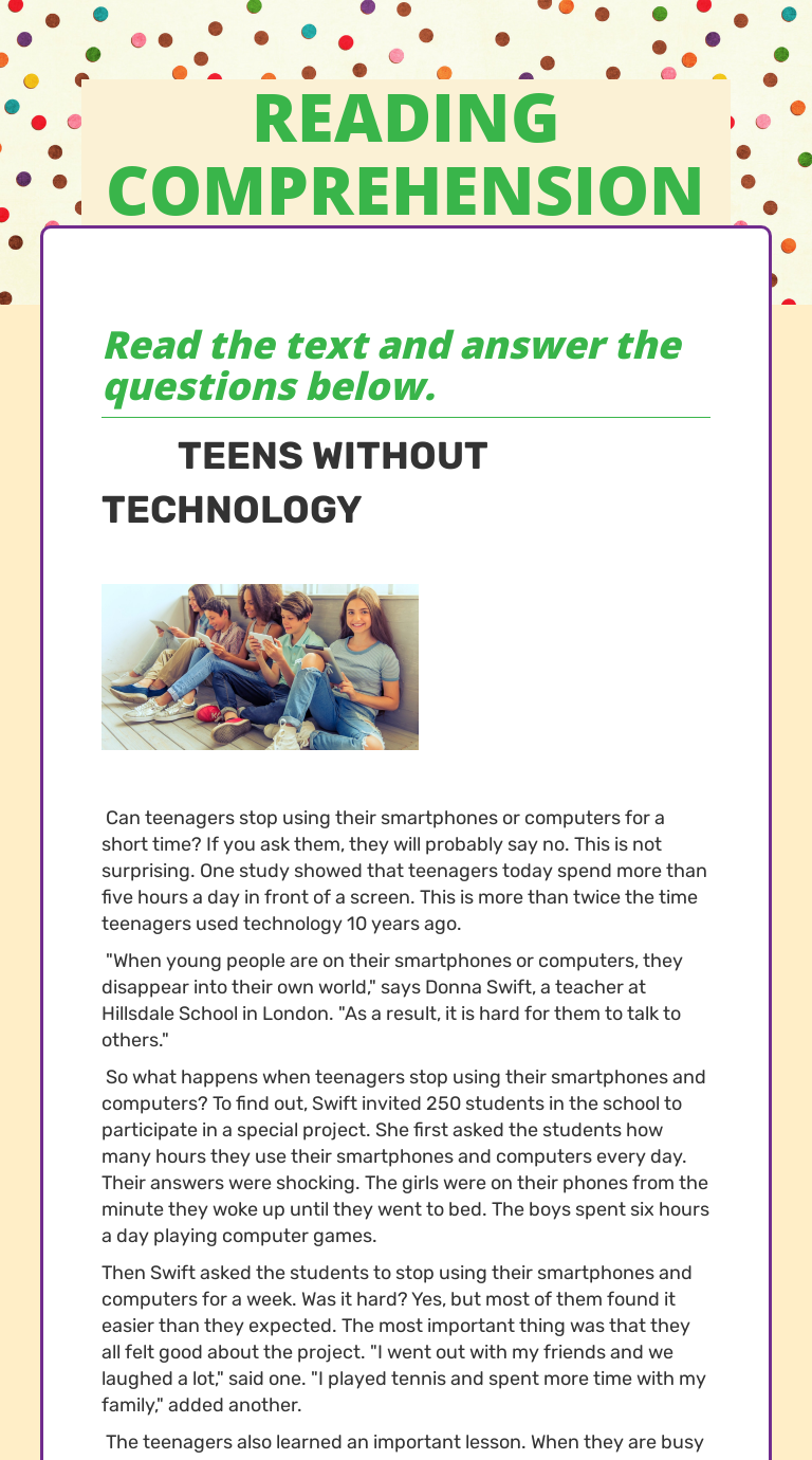 Reading Comprehension Worksheets for Grade 1 Go through this printable reading comprehension passage for grade 1 and answer questions in writing the theme of the text and more. Taking Turns Hudson suggests he and Sam take turns to play checkers first and then tag. Sam has a smile on his face, for he thinks taking turns will be fun and fair.