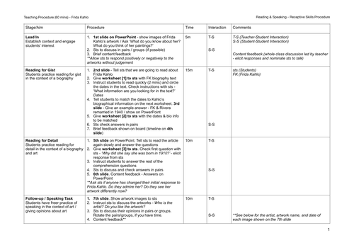 Frida Kahlo Art for Kid: Projects, Printables, and Biographies Frida Kahlo Lesson Plans To introduce Frida Kahlo in the classroom, here is a collection of resources for teachers and parents. Free Resources in English: Do a virtual tour of the Casa Azul (Blue House), shown above. Worksheet to go with TEDEd YouTube vide o about her life. (TpT) Home | Orchard Primary & Pre-School Lesson 4- Keith Haring; Lesson 5- Frida Kahlo; Drawing Challenge; Design and Technology; Music; Year 4 Summer 1 Topic. Week 1; Week 2; Week 3; Week 4; Week 5; Half Term Project; Year 4 Summer 2 Topic. Reign Over Us. Lesson 1; Lesson 2; Lesson 3; Lesson 4; Lesson 5; Lesson 6; Extra Activities; S2 Virtual School Trips. Week 1; Week 2; Week 3 ... PDF LESSON 4 - Kimball Art Center LESSON PLAN 1. Introduce students to the life and work of Frida Kahlo. Pull out a map and point out where Mexico is located. Notice how self-portraits were her favorite subject matter. Discuss how her self-portraits represent her unique identity. Point out elements in each piece that show realism, surrealism and symbolism.