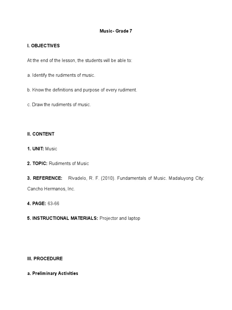 Lesson Plan Ideas For K-5 General Music Classes - NAfME This lesson plan is designed to teach students the concept of rhythm in a song, by listening to music and playing instruments to represent actions. The goal of this lesson plan is for students to learn how to keep a beat with the music. Music Substitute Lesson Plan (4th/5th Grade) for a non-music sub This is a lesson plan for 4th & 5th grade that will work whether or not the sub has any musical experience. They just need to read the script, play the awesome, short teaching videos, guide discussion and facilitate simple movement patterns. Download a PDF of this entire music substitute lesson plan - ready to go for your substitute! Detailed Lesson plan In Music V.docx - Detailed Lesson plan In Music 5 ... Detailed Lesson plan In Music 5 Quarter 2 Week 1 Day 2 I. Objectives At the end of the lesson the children are expected to: a) Identify the So-Fa syllables b) Sing the So-Fa syllables with hand sign. c) Demonstrate the So-Fa syllables II. Subject Matter a) Topic: So-Fa Syllables b) Reference 1. Melc: MU5ME-IIa-2 Pages: 341 2. Teacher's Guide ...