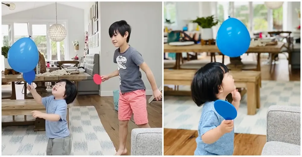 15 Awesome Balloon Games for Kids at Parties & Home Playing balloon tennis is the same basic idea as a real tennis game. Make your own rackets by taping a wooden spoon to the back of a paper plate. Then use a couch or chairs to create a net. Have the kids stand on each side of the net and hit the balloon back and forth like tennis. If the balloon hits the ground the other team gets a point.