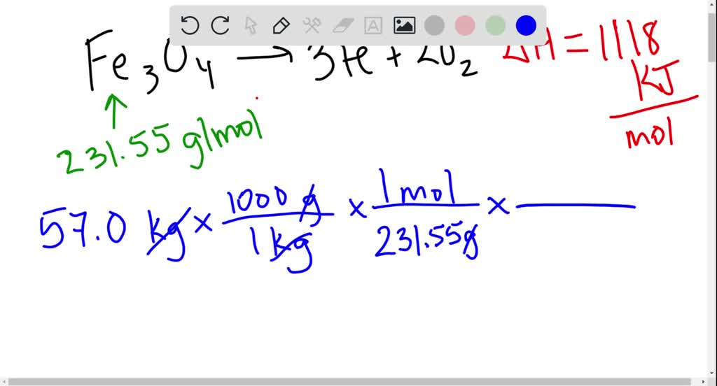 Calculate the energy required to decompose 57.0kg of Fe3O4 accordingto the following reaction? The molar mass of Fe304 is 231.55 gmoll Fe3O4(s) Ht 3 Fe(s) + 2 02lg) AHPrxn +1118kJ, 8.26 * 105 kJ, 0 ...