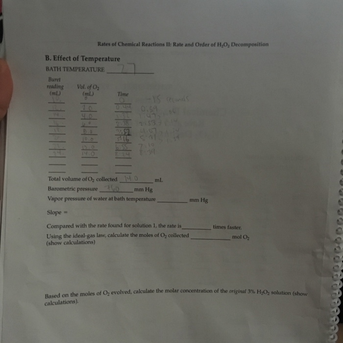 Rate and order of h2o2 decomposition lab answers. (PDF) monica clinical laboratory part 2 - Academia.edu monica clinical laboratory part 2 How catalyst affect activation energy - batteryfactory.shop In catalytic H 2 –D 2 equilibration, good correlation between the activation energy and the position of the d-band center was observed, experimentally demonstrating the validity of d-band theory. This small amount of energy input necessary for all chemical reactions to occur is called the activation nenergy (or free energy of activation) and is abbreviated E A. Activation energy: … chem lab Flashcards | Quizlet Which one of the following sets of units is appropriate for a second-order rate constant? ... You will need to generate a set of graphs to answer this question. Concentration vs time data for the following decomposition reaction was collected at 300 K. The data is shown in the table below. What is the rate constant for the reaction at this temperature (in units of min-1)? H2O2(aq) → … Fundamentals of Analytical Chemistry- 9th Edition - Academia.edu Each of the components in a mixture containing a strong acid and a weak acid (or a strong base and a weak base) can be determined provided that the concentrations of the two are of the same order of magnitude and that the dissociation constant for the weak acid or base is somewhat less than about 10 24.