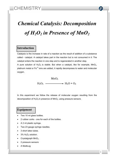 In Part 1 of this experiment, the decomposition of, H2O2 is studied by determining the, concentration of hydrogen peroxide at various times during the, reaction by titration with potassium ...