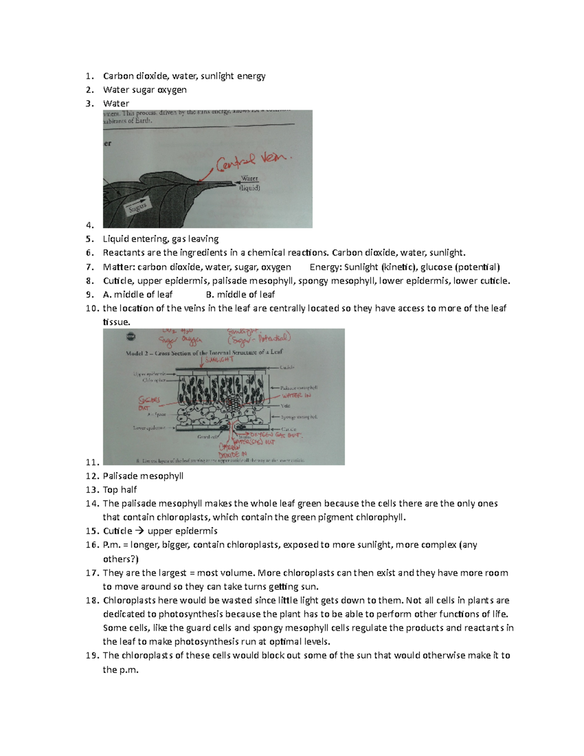 Photosynthesis what's in a leaf worksheet answers. What's in a Leaf 16) Palisade mesophyll have lots of chloroplasts, arranged vertically, tightly packed, and larger. 17) More cells = More chloroplasts = More photosynthesis ... Kami Export - Cali B - 12 Photosynthesis-What's in a Leaf-S - StuDocu Use the general equation for photosynthesis and Model 1 to answer the following questions. a. What are the reactants for photosynthesis? b. Where do these ... Photosynthesis Whats in a Leaf Answers - ENGIN 5 - UCB - StuDocu 10. the location of the veins in the leaf are centrally located so they have access to more of the leaf. tissue. 11. 12. Palisade mesophyll. 13. Top half. Photosynthesis: What's in a Leaf? - Nauset Schools General Equation for Photosynthesis. Reactants. Products light carbon dioxide + water sugars + oxygen energy. 1. List three things entering the leaf in ...