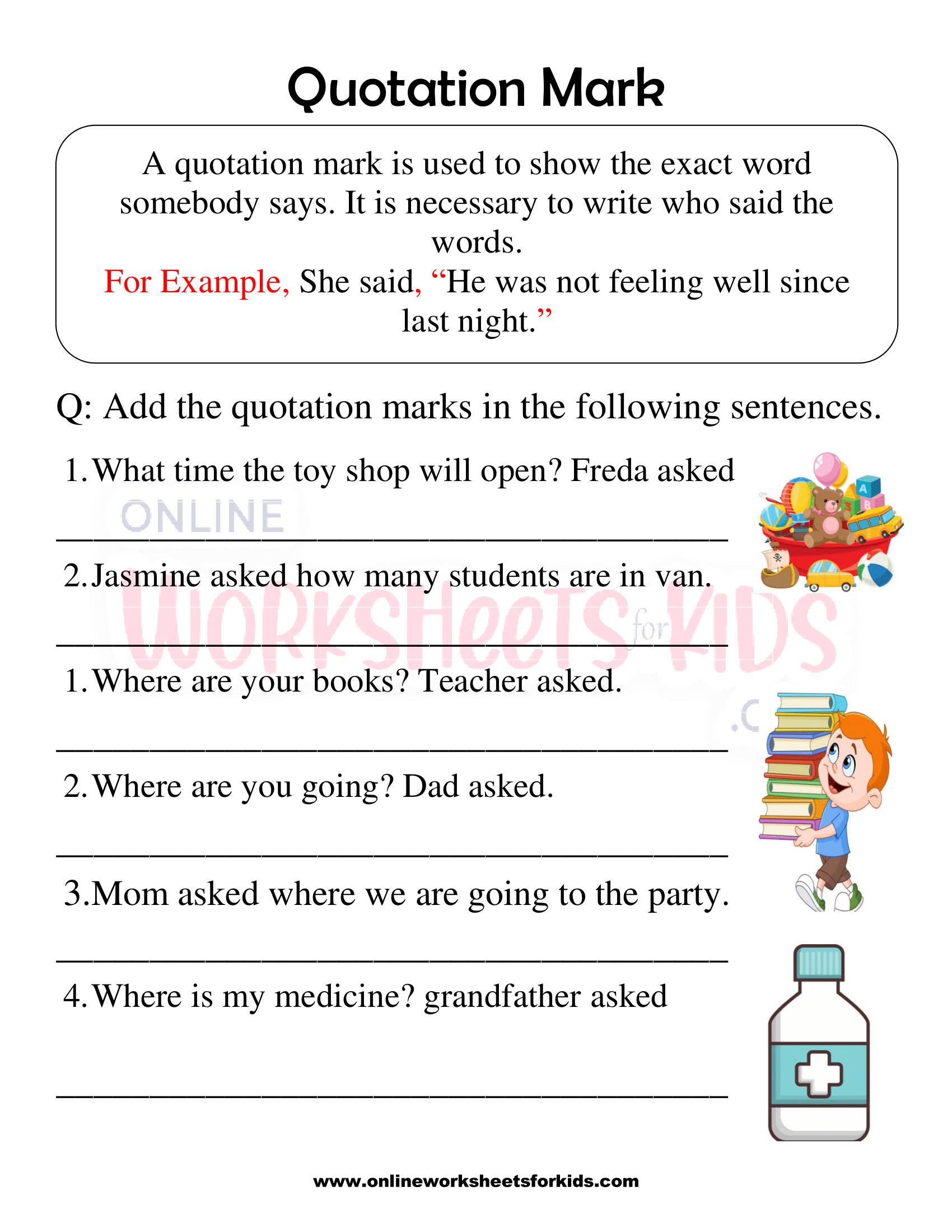 2nd Grade Quotation Marks Worksheets - K12 Workbook 2nd Grade Quotation Marks Displaying all worksheets related to - 2nd Grade Quotation Marks. Worksheets are Dialogue tags, Quotation marks for dialogue, Quotation marks, Use editing marks to correct the rewrite the, Punctuation, Punctuating dialogue and direct quotations dozen rules, Reading literary rl reading, Ab2 gp pe tp cpy 193601. Quotation Marks Worksheets for Student Practice (Free ... Using Quotation Marks Correctly Worksheet When it comes to quotation marks, 2nd and 3rd grade students are just beginning their adventure into the world of writing. Not only are they still adapting to sentence structure and parts of speech, but they're also learning when and how to use quotation marks. Quotation Marks 2nd Grade Worksheets - Printable Worksheets Showing top 8 worksheets in the category - Quotation Marks 2nd Grade. Some of the worksheets displayed are Dialogue tags, Quotation marks for dialogue, Using quotation marks ws 1 date period, Quotation marks, Use editing marks to correct the rewrite the, Quotation review work name date period, Viu grammar and punctuation study guide 3 capitalization, Introduction.