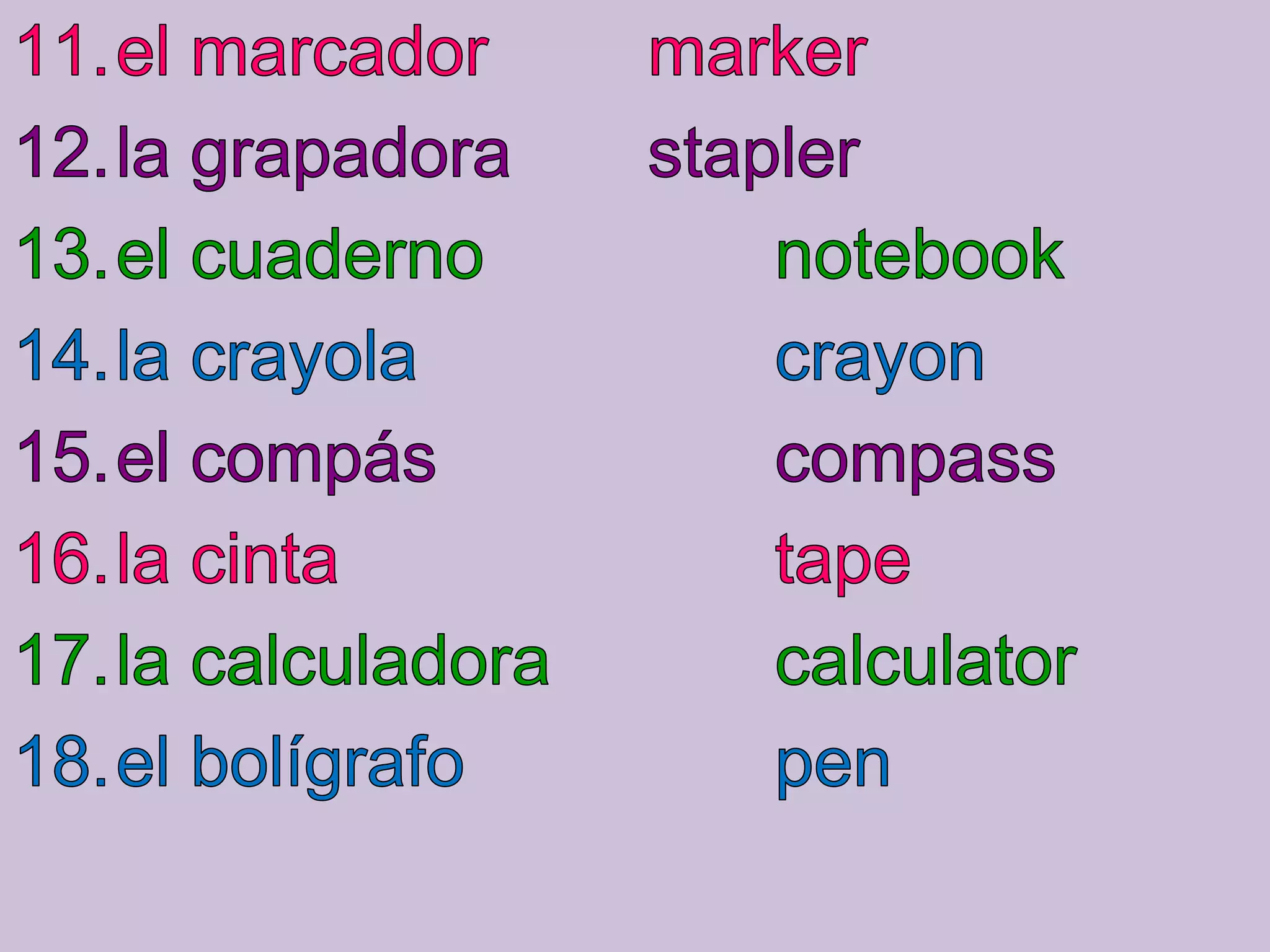 School Supplies Spanish Flashcards | Quizlet School Supplies in Spanish Terms in this set (30) el calendario Calendar el marcador marker la bandera flag la computadora computer el papel paper la regla ruler las tijeras scissors el reloj clock la tiza/el gis chalk el sacapuntas pencil sharpener la calculadora calculator la cola/el pegamento/el resistol glue el diccionario dictionary la clase