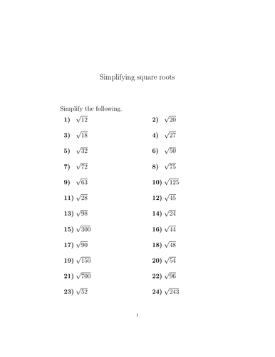 Simplifying Radical Expressions Worksheets - Math Worksheets 4... Simplifying Radicals Kick into gear with this bundle of printable simplifying radicals worksheets, and acquaint yourself with writing radical expressions in the simplest form. The radical expressions presented in these pdfs have the index 2 and 3 – that is to say, only square roots and cube roots are depicted to facilitate foundational ... Simplifying Square Roots Worksheets | Online Free PDFs - Cuemath Download Simplifying Square Roots Worksheet PDFs. These math worksheets should be practiced regularly and are free to download in PDF formats. Simplifying Square Roots Worksheet - 1. Download PDF. Simplifying Square Roots Worksheet - 2. Download PDF. Simplifying Square Roots Worksheet - 3. Download PDF.