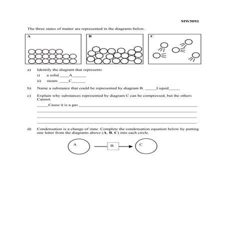 The three states of matter test questions - AQA - BBC Bitesize The three states of matter can be represented by the particle model. This model explains the properties of substances in their different states, as well as changes of state. Part of... States of Matter - Practice Test Questions & Chapter Exam | Study.com States of Matter Chapter Exam Exam Instructions: Choose your answers to the questions and click 'Next' to see the next set of questions. You can skip questions if you would like and come back... States of Matter | States of Matter Quiz - Quizizz What are the three states of matter? answer choices Rock, Brick, Shoe Solid, Liquid, Gas Liquid, Water, Soda Rain, Sleet, Snow Question 2 30 seconds Q. When water vapor gets cold, it turns to a... answer choices liquid solid raindrop ice Question 3 30 seconds Q. What is an example of a solid turning into another state of matter? answer choices PDF States of Matter Test - CCSESA Arts Initiative States of Matter Test 1. Everything around us is_____. A) energy B) matter C) waves D) solids 2. What had a definite shape and a definite volume? A) liquid B) solid C) gas D) all of the above 3. Which is not an example of a solid? A) spoon B) blanket C) hair D) lemonade 4. What is air made of? A) gases B) liquids C) solids D) water 5.