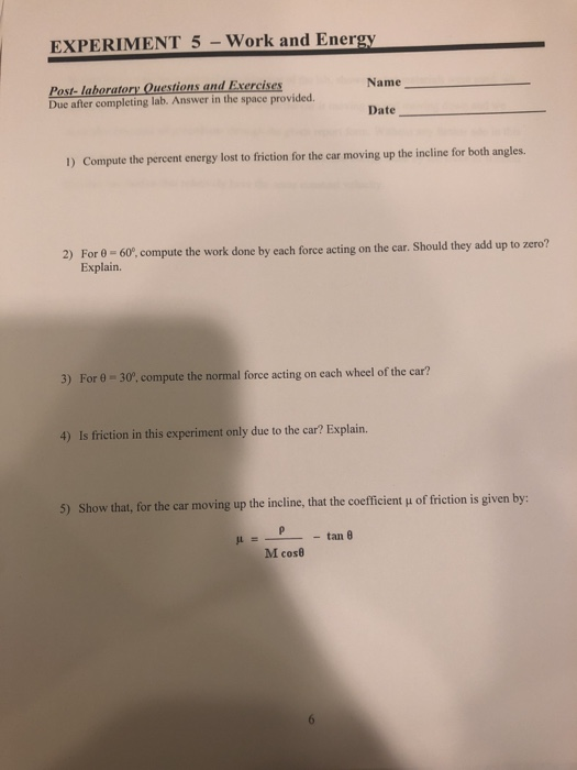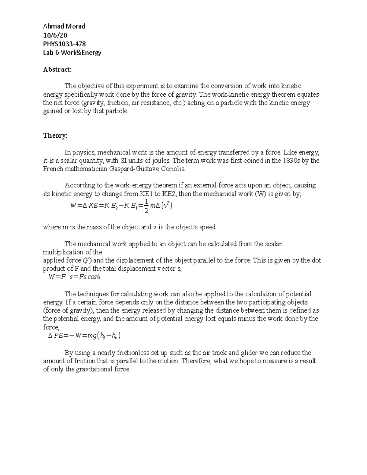 6a1 Work and energy 111A - Physics Laboratory Report Title (5 ... INTRODUCTION (5 points) 1 The objective with this lab is to prove the work energy theorem which is mathematically written as W(work) = Δ KE (change in kinetic energy). In this experiment we will by practically monitoring the work done on an object by a constant force and kinetic energy acting on the object.