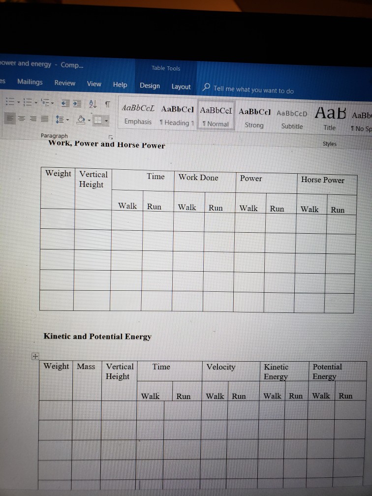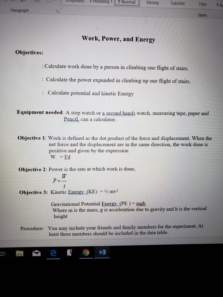 Work and energy lab report. Lab 8 Work and Kinetic Energy - phys.ttu.edu Lab 8 Work and Kinetic Energy - phys.ttu.edu WORK AND ENERGY EXPERIMENT - University of Alabama WORK AND ENERGY EXPERIMENT Introduction This lab has two goals. The first is checking the validity of the work-energy theorem. You will measure the work done by a force acting on a cart and also measure the change in kinetic energy of the cart to verify if they are equal. The second goal is to check the conservation of mechanical energy. Work and Energy - p101 - Bowling Green State University Work and Energy Goals and Introduction In this experiment, we test and apply the principle of conservation of energy and the work-energy theorem. The work-energy theorem states that if there is work, W, performed on an object as it moves from one location to the next, then the kinetic energy, KE, of the object changes. We PHYS221/222 “Work & Energy” rolls If your report includes a plot, you should always discuss the primary physics the plot demonstrates. In general your lab experiment will emphasize only one or two physics points. You should always discuss discrepancies when applicable. You should always discuss uncertainties and errors and their effect on an