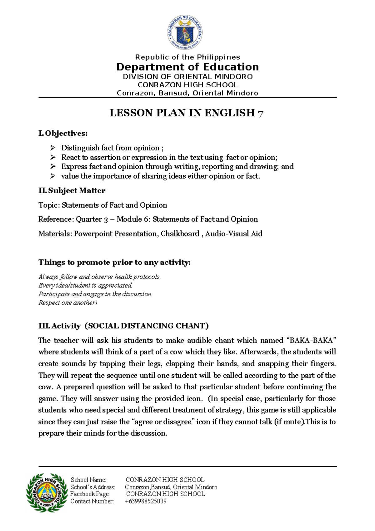 Detailed Lesson Plan in Fact and Opinion - SlideShare Keeping an open mind means to wait until you know all the facts before having an opinion or making judgment. This is important when identifying facts and ... Fact and Opinion Lesson Plan: Text Types and Purposes Fact and Opinion Lesson Plan: Text Types and Purposes · Make-a-Movie: Create a news report about an event at your school that uses both facts and informed ... Fact or Opinion | Lesson Plan | Education.com Help your ELs learn to understand and differentiate between fact and opinion through the analysis of nonfiction text. This can be a stand-alone lesson or a ...