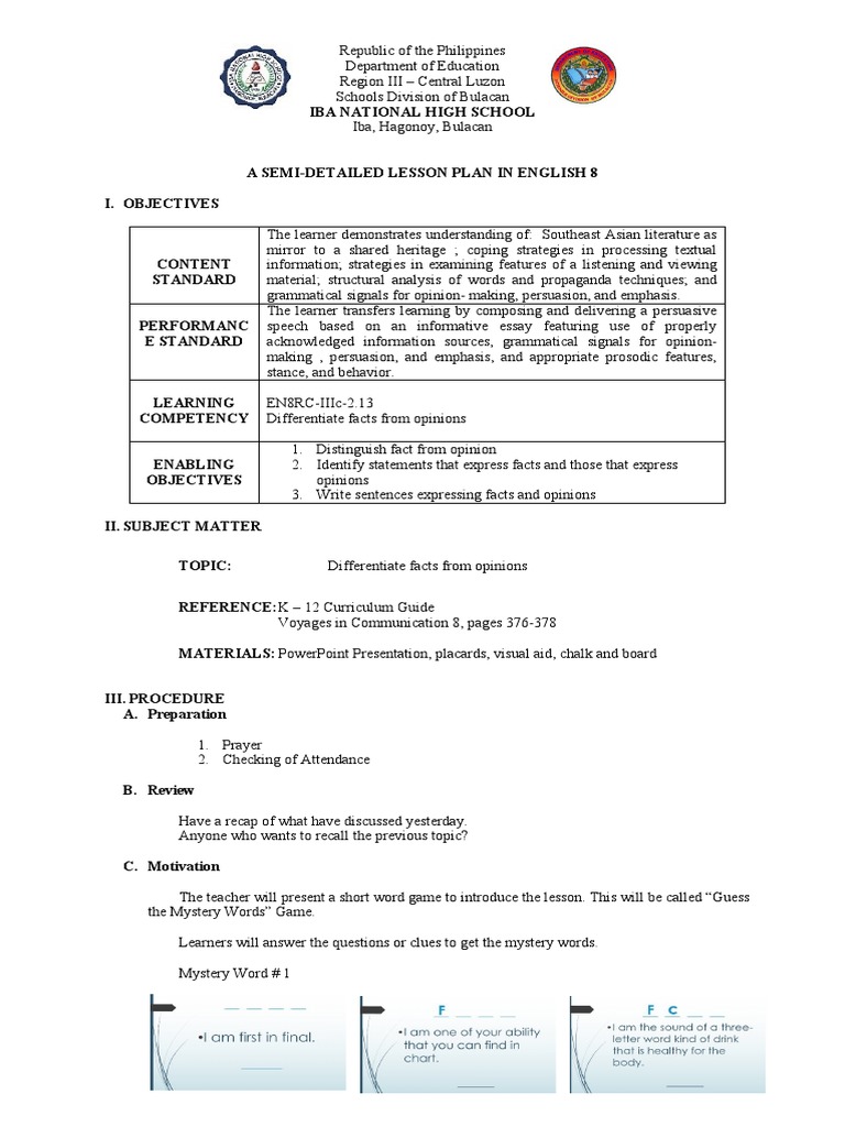 Fact and opinion lesson plan. Fact or Opinion? - Teach Starter Teacher Instruction · Project the Fact or Opinion - Turtles Worksheet on the board. Read each statement aloud and ask the students to identify it as a fact on an ... Fact & Opinion Lesson Plan | Study.com Connect students to learning and refresh prior knowledge by giving them 3-5 minutes to brainstorm and write everything they know about facts and opinions. Can You Prove It? Facts and Opinions! | Lesson Plan | Education.com Introduction · Write the following sentence on the board: My friend's favorite color is yellow. · Distribute the index cards, and ask each student to write "pre- ... Lesson PLAN IN English 10 (Fact or Opinion) - Studocu At the end of the lesson, students should be able to: A. Identify statements of fact and opinion; B. Differentiate fact from opinion; and C. Formulate ...