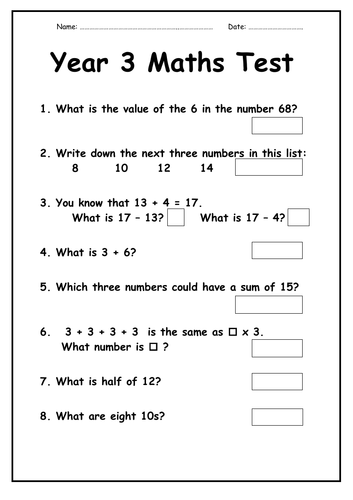 End of Year 3 Maths Assessment Test - Primary Resources - Twinkl This pack of 7 assessments is created in line with the 2014 Maths Curriculum for Year 3 and is ideal as an end of the year activity. The materials in the year 3 Maths assessment pack cover a variety of topics taught at this school year and the aims assessed by each question are clearly stated. A marking scheme is also provided to make it easier for checking children's score.You can ...